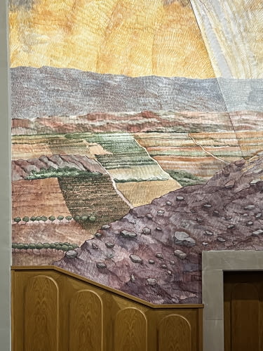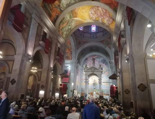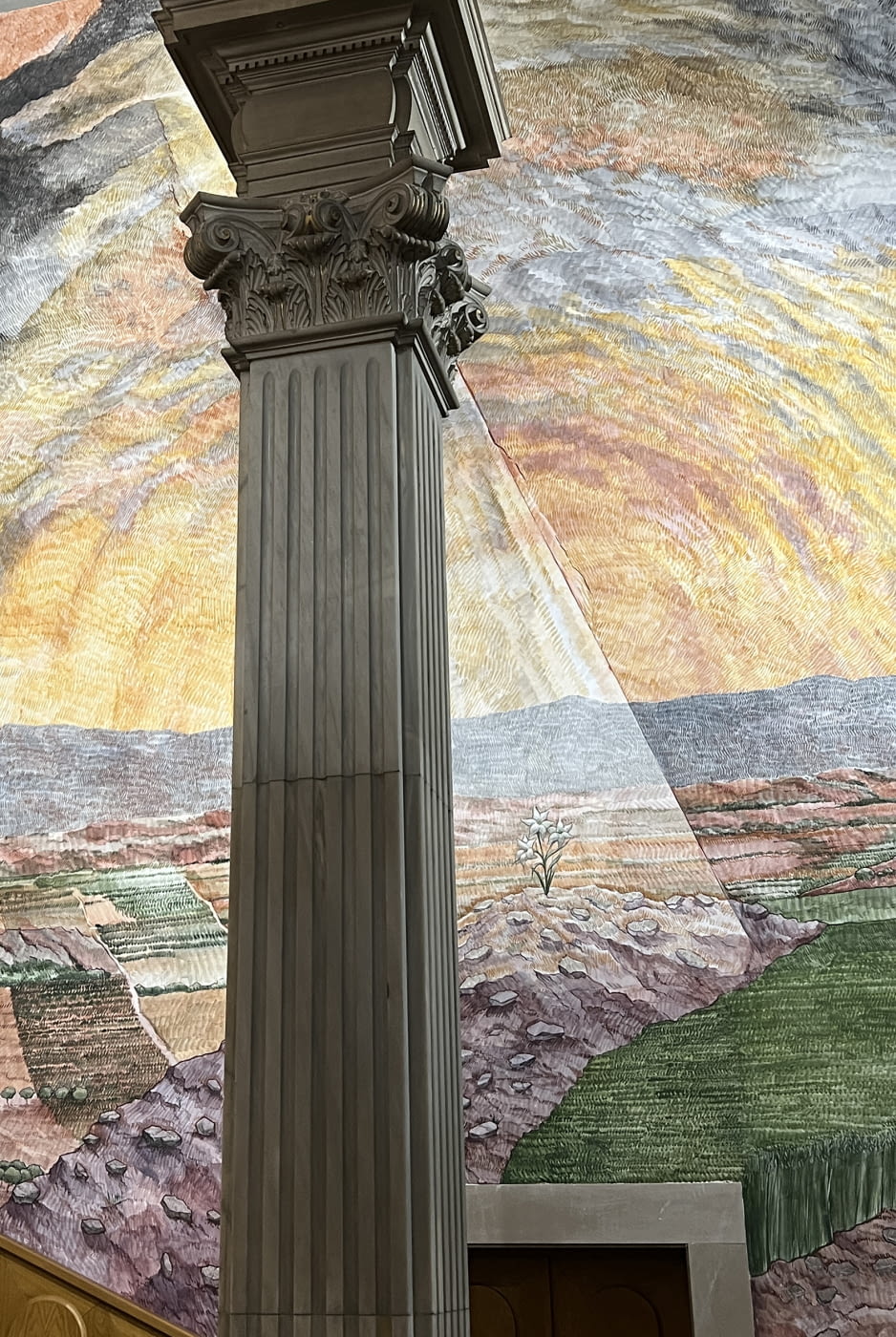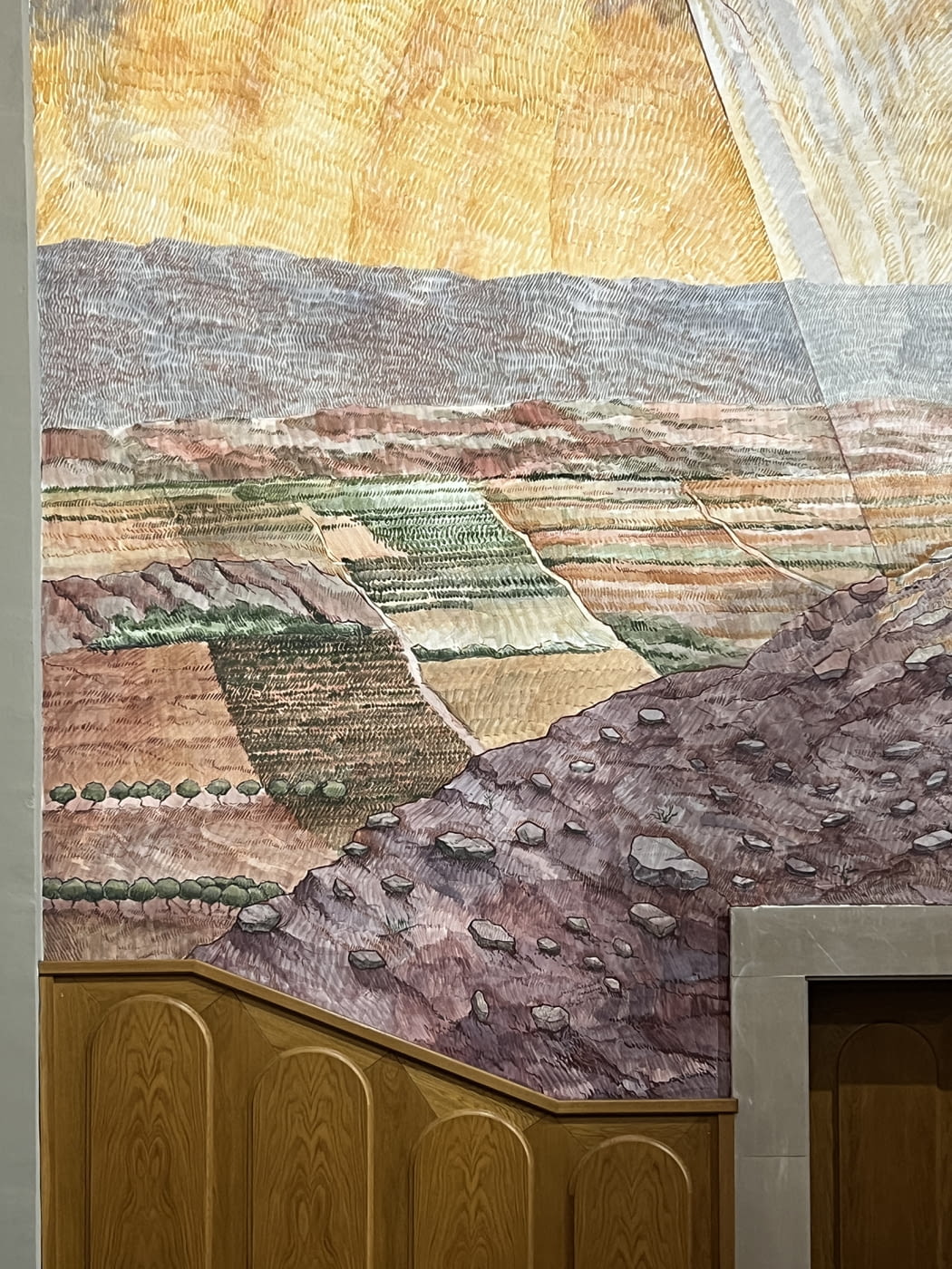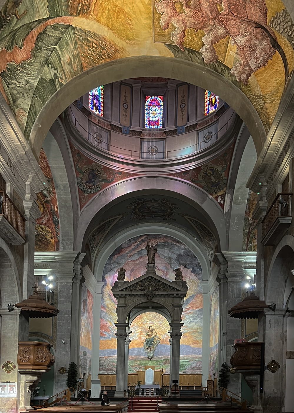 The paintings in the presbytery mark the final phase of the fresco cycle of Santa María del Alba, begun in 2005 and covering 1,014 square meters. The pictorial ensemble integrates into the proportions of the Baroque architecture of the church, seeking harmony between architecture and painting.